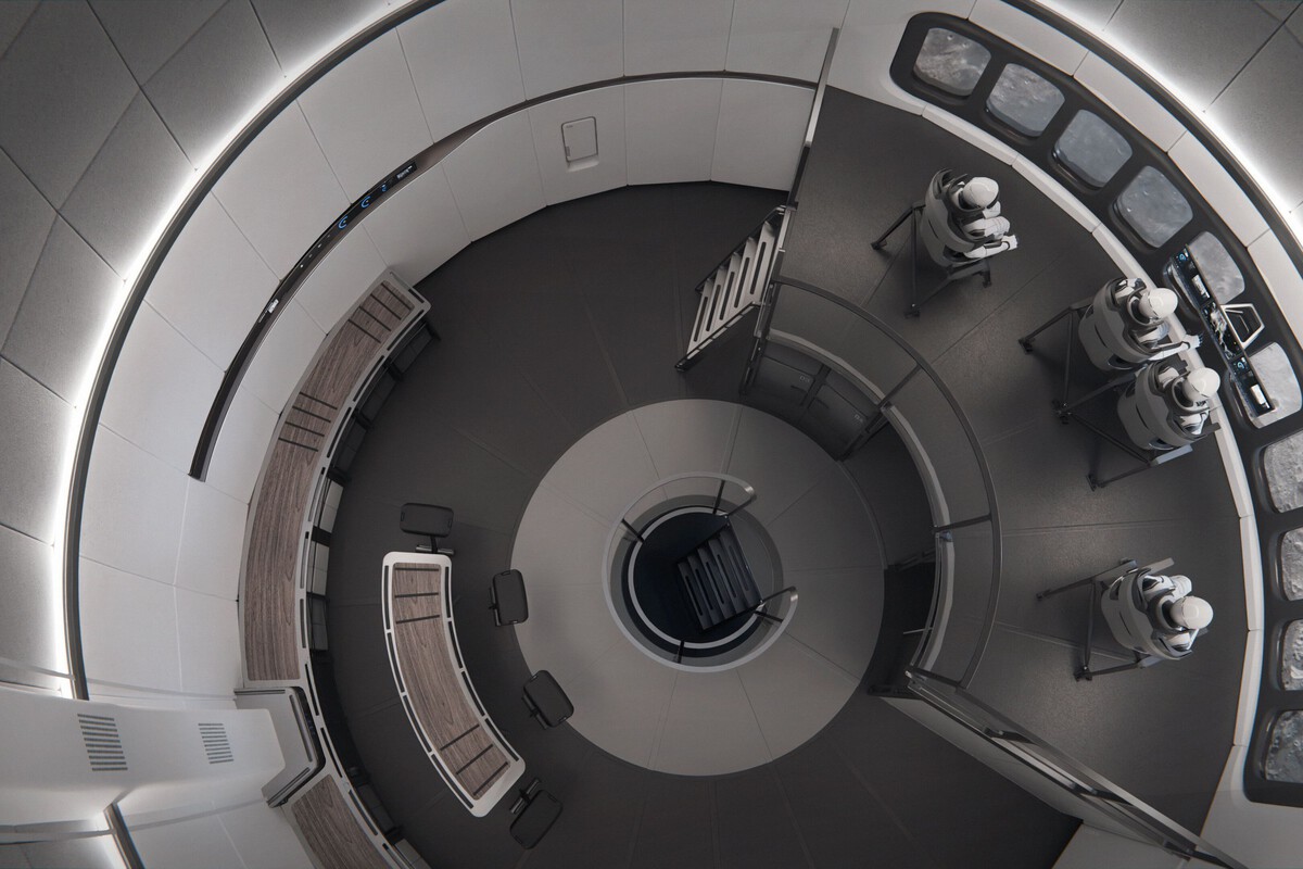 Esqueça a imagem de astronautas apertados em uma lata de alumínio. O que vemos é um interior amplo, com vários andares, de estética limpa e futurista. Há uma escada em espiral, uma área de controle com múltiplos assentos e uma janela panorâmica que oferece vistas da superfície lunar.