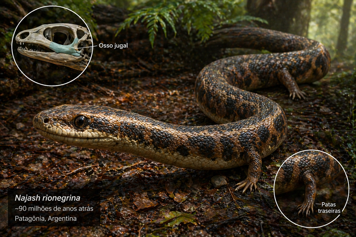 A espécie Najash rionegrina revelou que as serpentes ancestrais possuíam patas traseiras e até mesmo um osso na bochecha, chamado osso jugal, que praticamente desapareceu nas espécies modernas.
