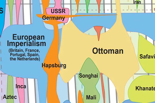 Aquelas sem estados centralizados, registros escritos ou controle territorial expansivo, como as culturas indígenas americanas ou subsaarianas, não estão representadas. Mas, apesar disso, é um excelente gráfico que permite acompanhar uma narrativa sobre impérios desde antes de 3.000 a.C. até os dias atuais.