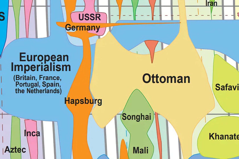 Chama-se World GeoHistogram e combina geografia e tempo numa estrutura visual unificada que mostra claramente a ascensão e queda dos impérios. A história não é um jogo de soma zero em que, quando um império cai, outro surge imediatamente, é um pouco mais complexo, mas o gráfico permite-nos apreciar de forma muito visual não só os impérios que se sucedem, como também aqueles que se desenvolvem em paralelo e com os quais podem entrar em conflito.