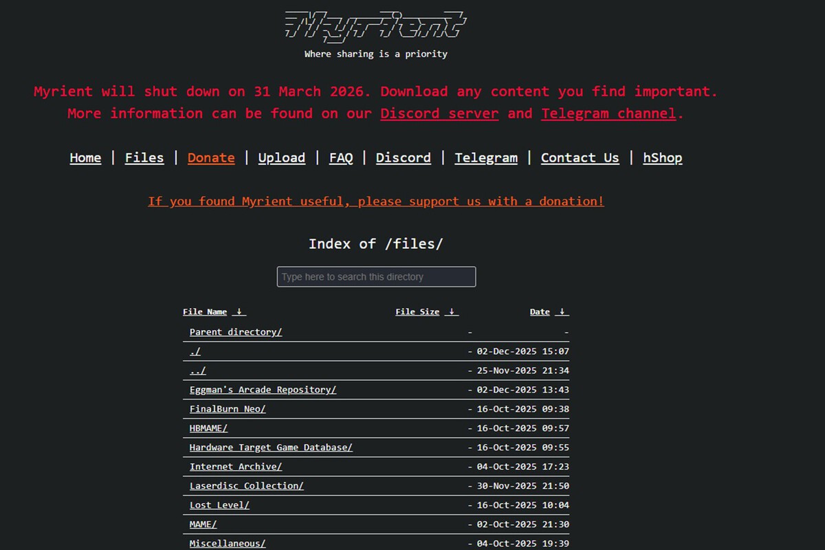 Em um comunicado no Telegram e no Discord, foi informado que o arquivo Myrient será encerrado em 31 de março de 2026. No Myrient são preservadas versões de clássicos de arcade e de consoles, assim como, entre outras coisas: