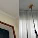 O processo começa umedecendo um pano na mistura. Para tetos ou áreas altas, onde o acesso é mais difícil, Andrea sugere uma solução prática: prender o pano a um esfregão, tornando a limpeza fácil e segura.
