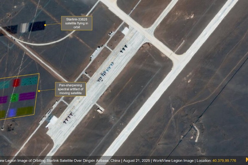 Uma nave espacial prateada com dois grandes painéis solares e três espectros de cores cruza a foto da Maxar, criando o que um executivo da empresa descreveu no LinkedIn como "arte acidental". O que vemos é, na verdade, um único satélite, o Starlink 33828, imortalizado em diferentes comprimentos de onda sobre um dos locais mais sensíveis das forças armadas chinesas.