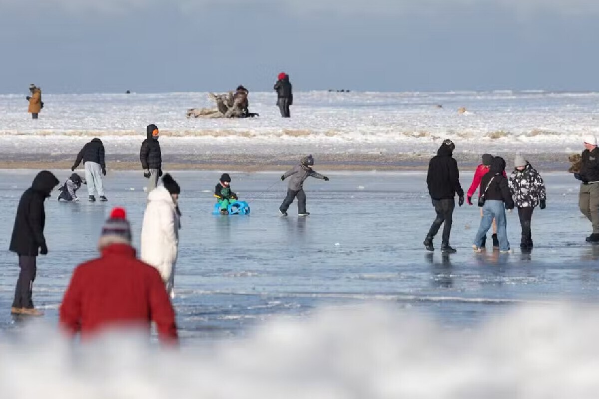 Frio extremo transformou a paisagem e atraiu moradores a caminhar sobre o mar congelado