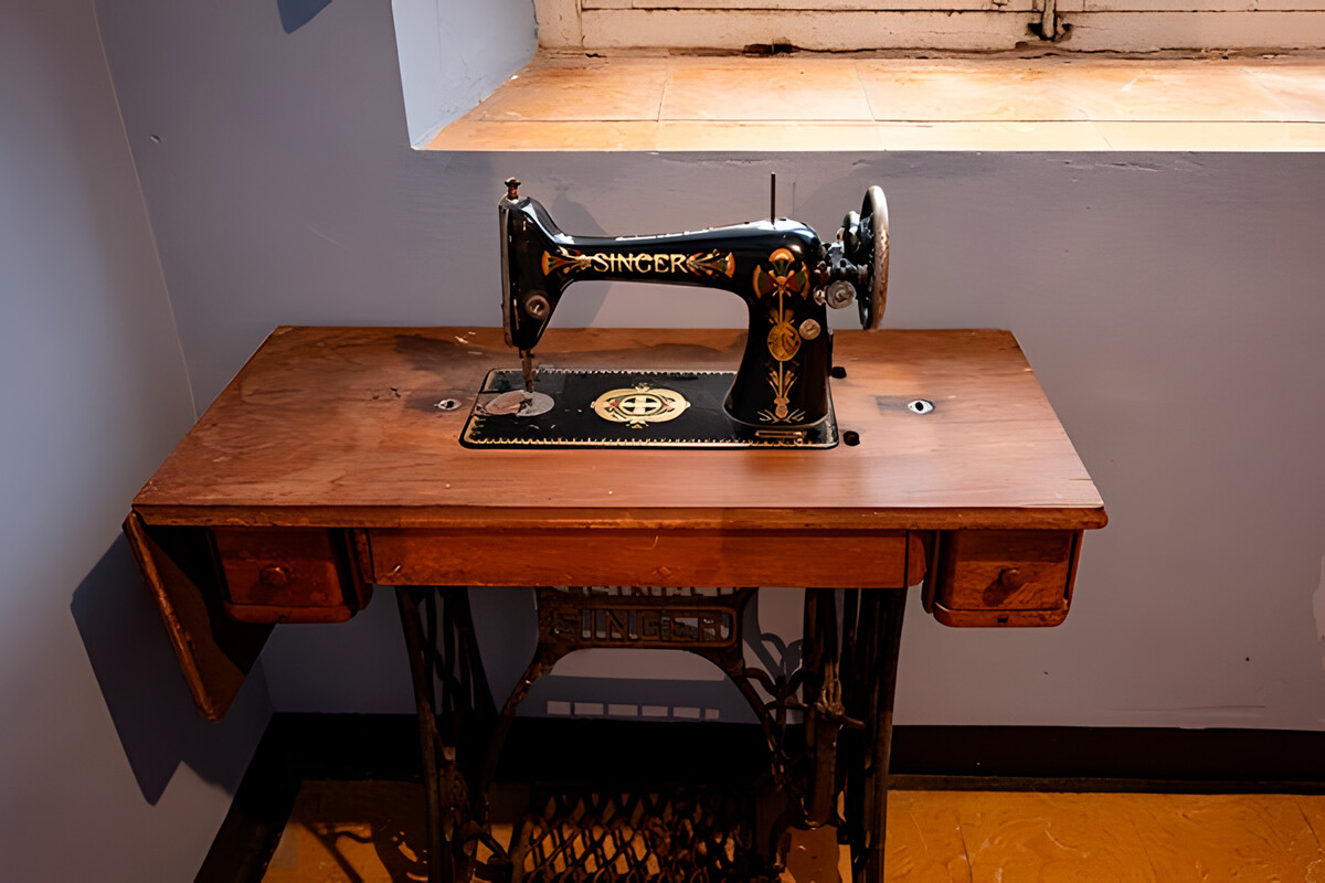 A primeira vez que vi uma máquina de costura antiga foi na casa da minha avó. Era como uma escrivaninha com base de metal preto, muito resistente, e com madeira grossa. Tinha algumas gavetas e, em cima, como parte principal, uma máquina preta, mas com uma roda e uma grande ponta com agulhas em um dos lados.