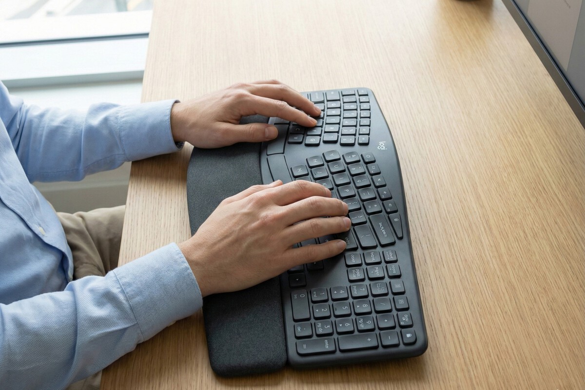 Isso mudou com o Logitech K860. Meu primeiro teclado ergonômico não só confirmou várias suspeitas antigas, como também me fez repensar hábitos que eu simplesmente aceitava como normais. Digitar torto, ombros tensos, punhos forçando posições estranhas. Nada disso parecia um problema imediato, mas o K860 deixa claro que conforto não é luxo: é prevenção.