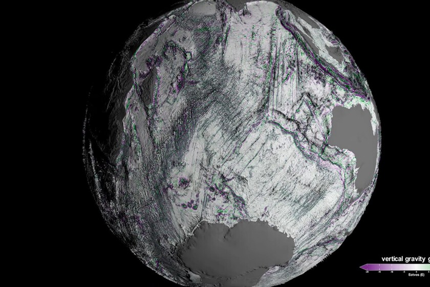 Com este mapa de gradiente de gravidade vertical, a NASA criou um modelo 3D que permite aos usuários navegar e ampliar todas as profundezas dos mares e oceanos da Terra. A imagem revela colinas abissais individuais que se estendem por 200 a 300 quilômetros, juntamente com outros montes submarinos menores e estruturas tectônicas anteriormente ocultas.
