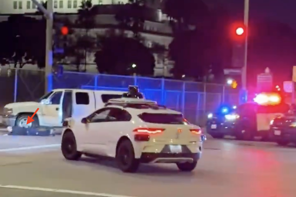 No vídeo, o Jaguar I-Pace da Waymo faz uma conversão à esquerda em cima do fim do sinal amarelo. Do outro lado da via, o cenário é tudo menos comum: várias viaturas bloqueiam o cruzamento, luzes azuis e vermelhas piscam sem parar e policiais apontam armas para um suspeito em uma caminhonete branca. Para qualquer motorista humano, o instinto de parar seria óbvio, além de desviar e manter distância. Mas o táxi robô simplesmente segue adiante, passando ao lado do veículo abordado e levando seus passageiros direto para a linha de ação.